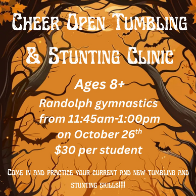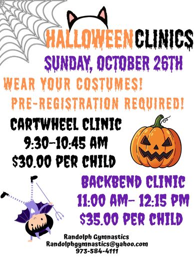 Along with our gymnastics class tricks, our regularly scheduled classes will have a spooky flair with themed music, fun, and treats!